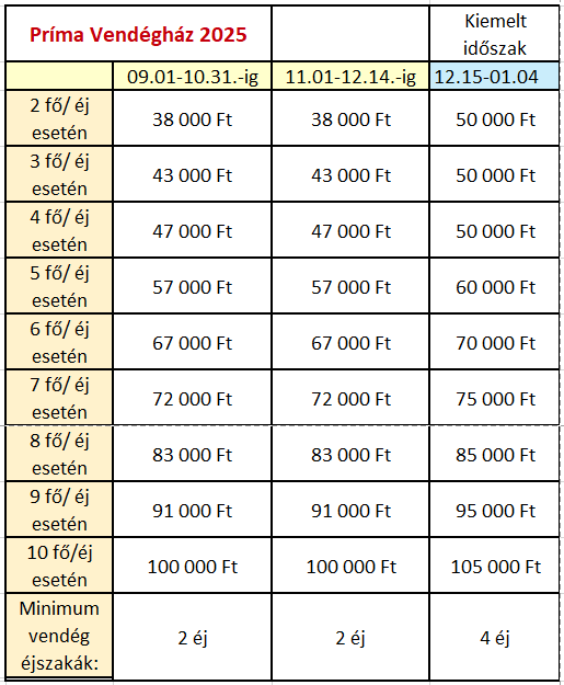 Áraink a teljes vendégház bérletére vonatkoznak, nem szoba árak, minden esetben ellátás és takarítási díj nélkül értendő. A takarítás díja egyszeri 20.000.-Ft amely a számlával együtt fizetendő.